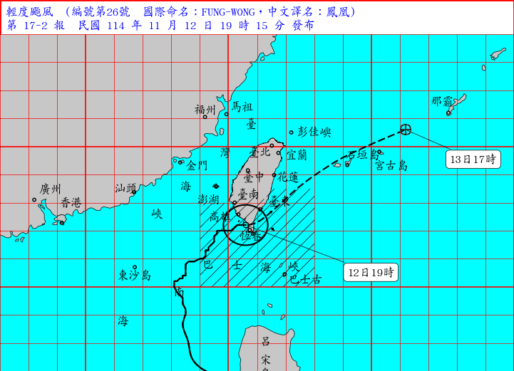 輕度颱風鳳凰(第17-2報)。第26號颱風過去3小時暴風圈縮小,中心位於鵝鑾鼻西北方近海,向東北轉東北東移動,對臺南以南及臺東構成威脅,預計此颱風有減弱為熱帶性低氣壓的趨勢。